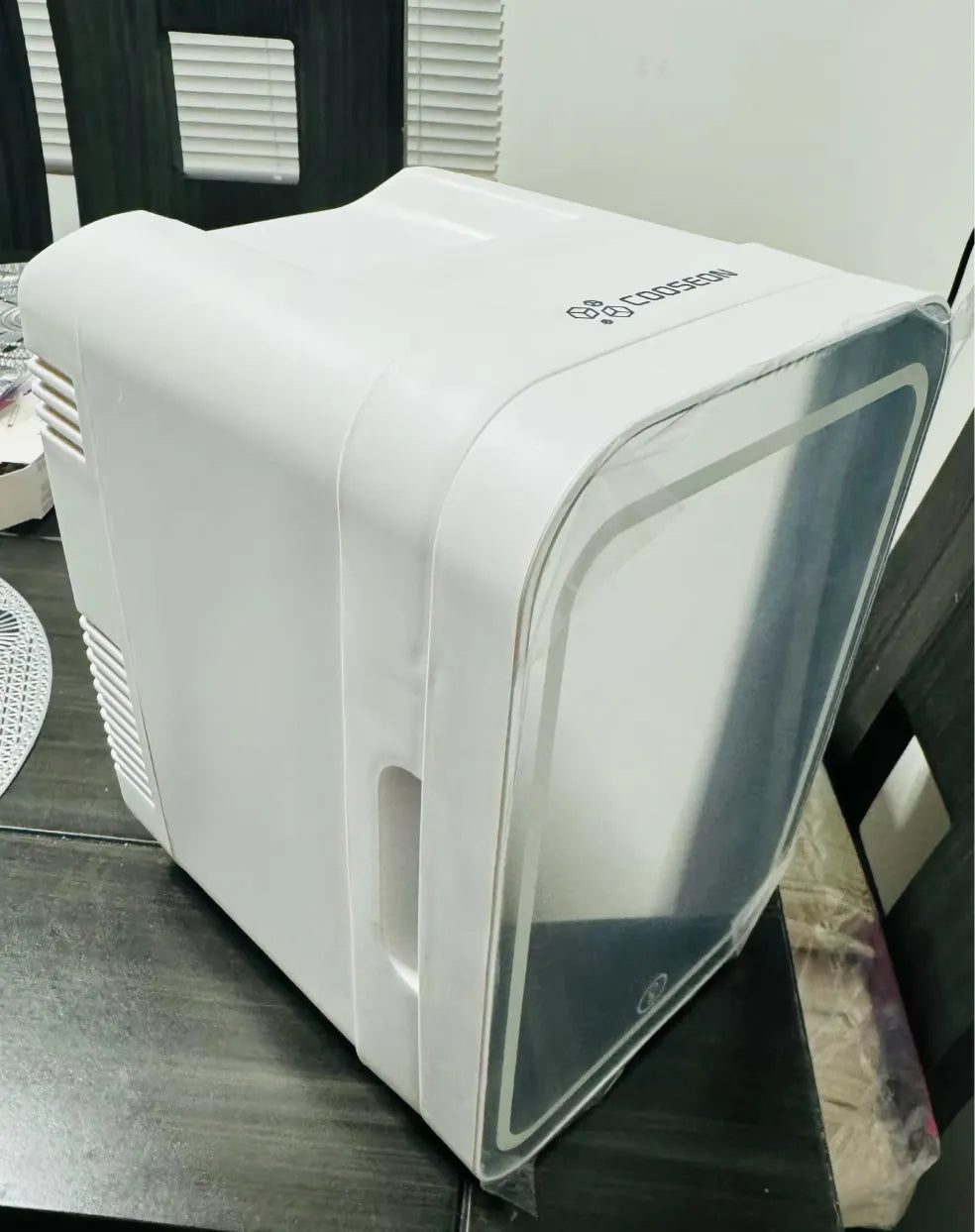 "OMG, this mini fridge is a game-changer for my skincare routine! I love how my creams and serums stay cool and fresh. The mirror on the door is perfect for quick touch-ups. It's super sleek and fits perfectly on my vanity. Totally worth it!🎉💄"